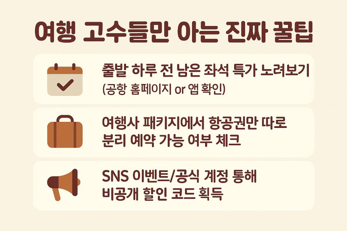 - 출발 하루 전 남은 좌석 특가 노려보기 (공항 홈페이지 or 앱 확인)